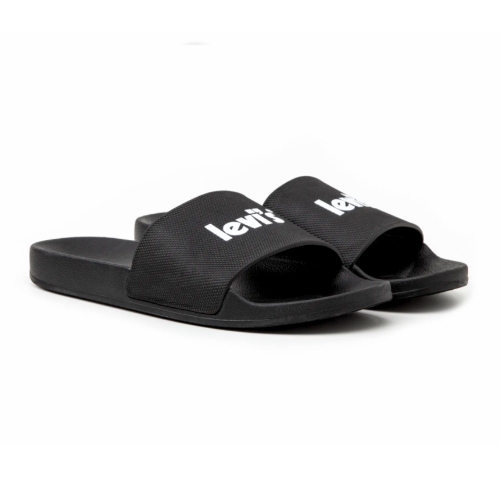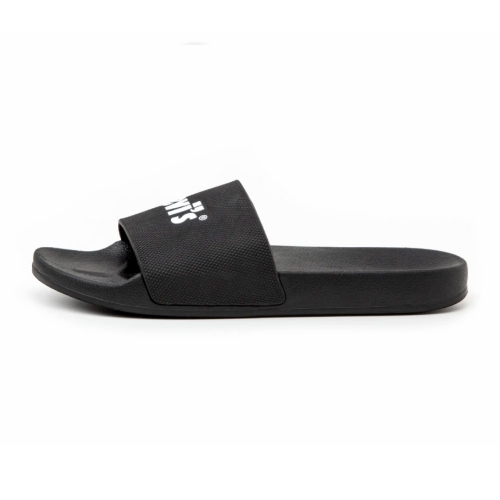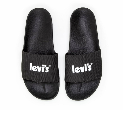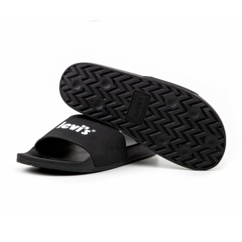 Chancla pala  negra con logo de la marca en blanco , con carácter. Llévalos con sudaderas, vaqueros o pantalones cortos, en la playa, en una salida de BBQ o para ir a la aventura. Verás el género: son tus sandalias de corazón del verano, con el logotipo de Batwing Levi's.