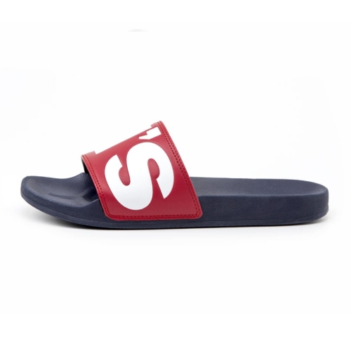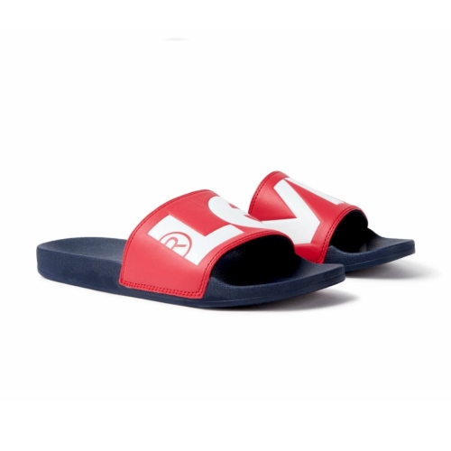 Chancla pala  azul y pala rojo  con logo de la marca en blanco, con carácter. Llévalos con sudaderas, vaqueros o pantalones cortos, en la playa, en una salida de BBQ o para ir a la aventura. Verás el género: son tus sandalias de corazón del verano, con el logotipo de Batwing Levi's.