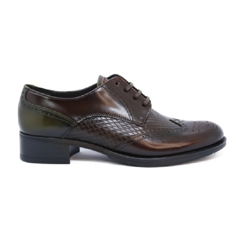 Blucher de mujer realizado en piel de primera calidad. En tonos marrones y verdes con detalles efecto serpiente. Corte pala vega con picados en su parte delantera. Interior totalmente forrado en piel incluido la suela. Cosido y pegado a mano.