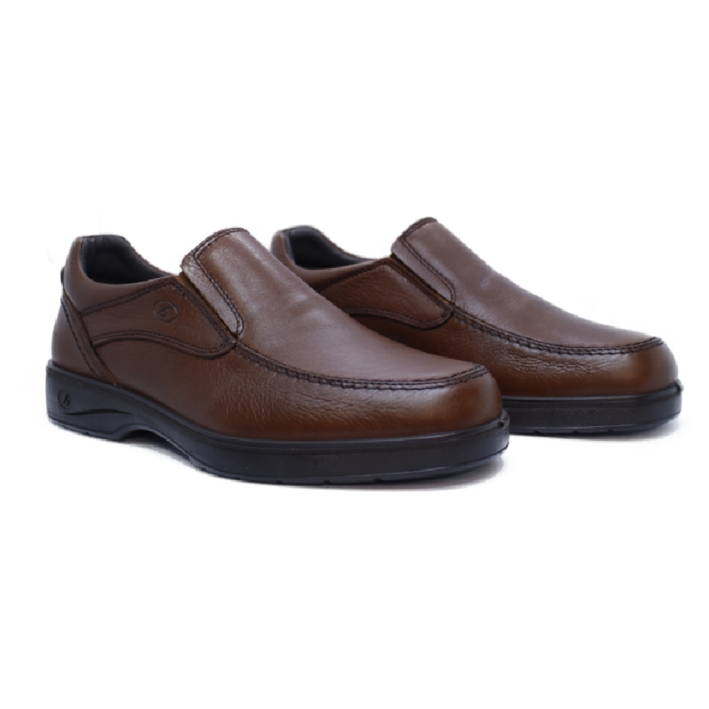 Mocasín de hombre que se ajusta mediante elásticos laterales. Fabricado en piel napa color coñac.