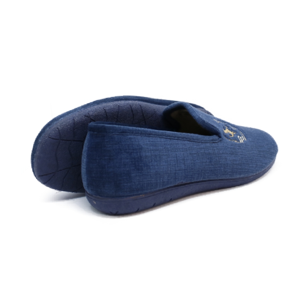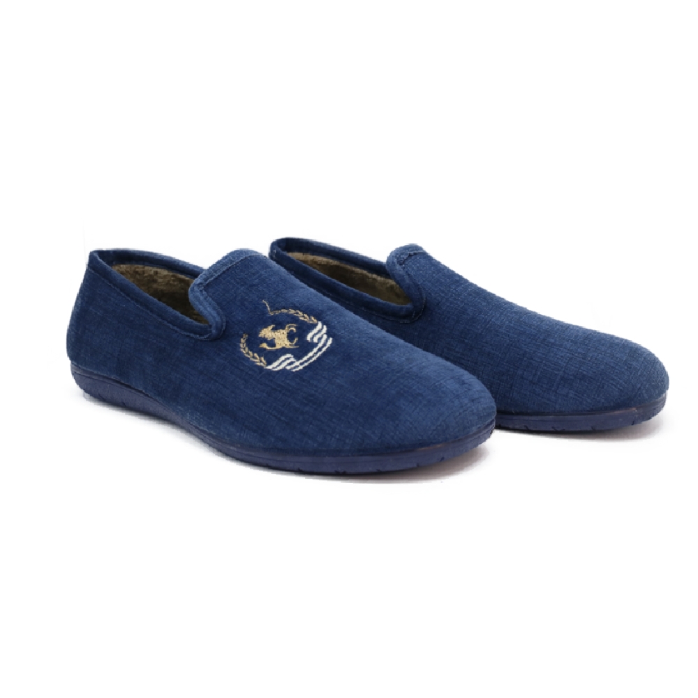 Zapatilla de casa para hombre realizada en suave tejido bamara. Suela de caucho antideslizante. Detalle de escudo bordado.