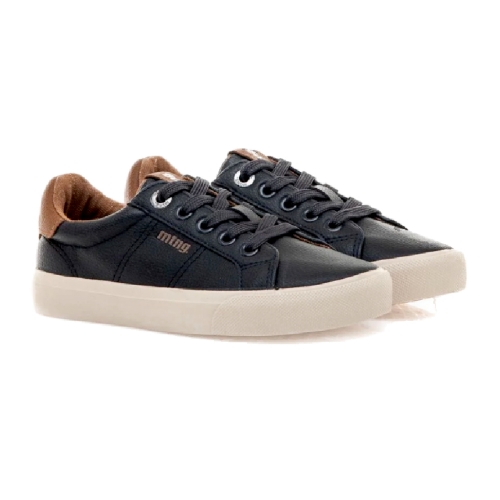 Zapatilla Emi Mustang para niño, diseñada en color azul marino con cordones al tono, incluye la trasera de color marrón cuero. Logo de la marca en la lengüeta y lateral de la zapatilla. Le ayudarán a llegar más lejos en su día a día.