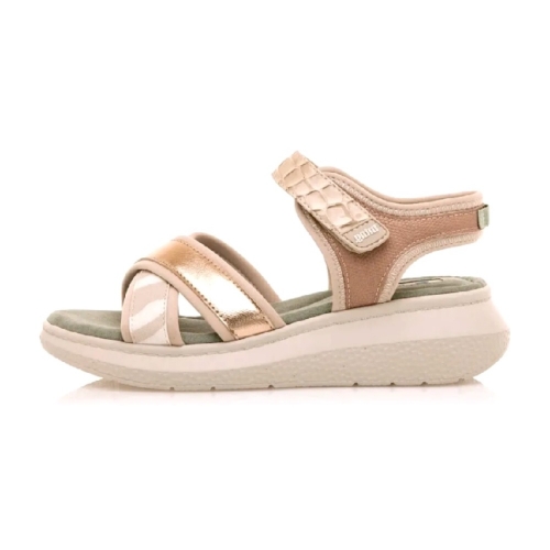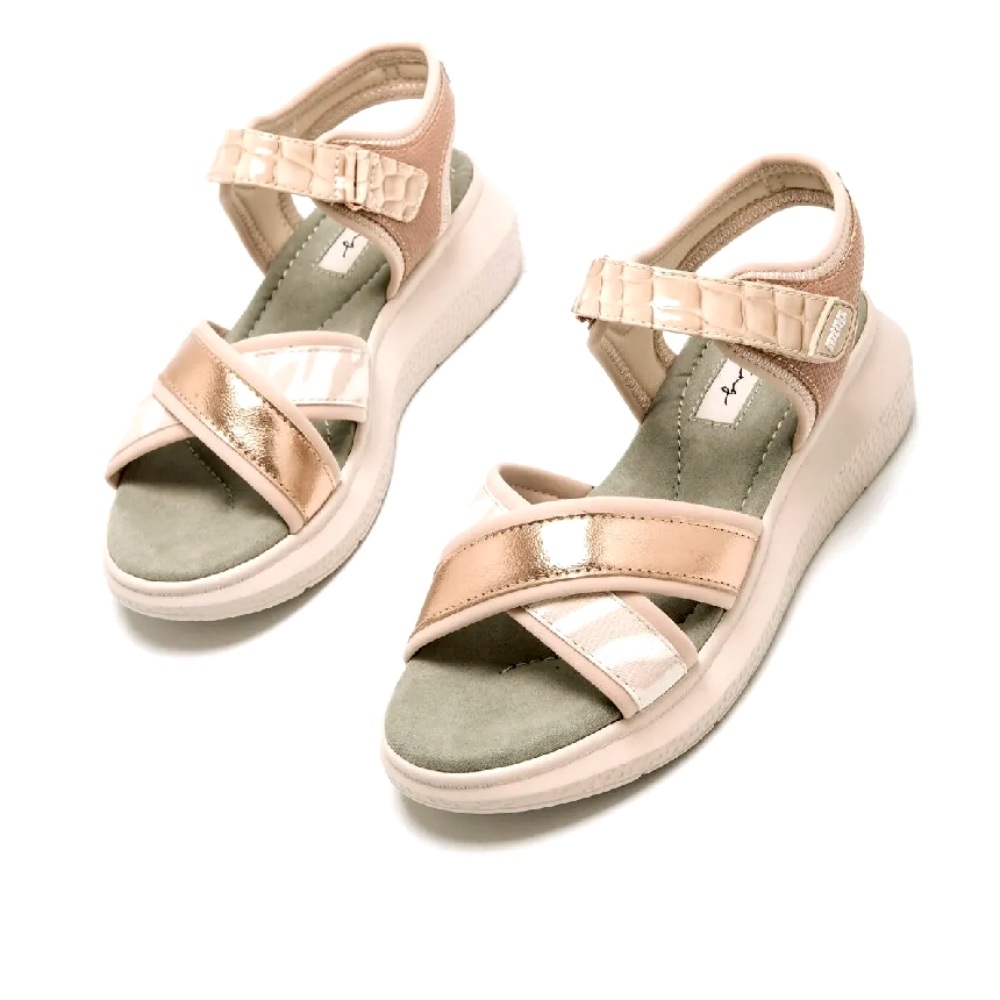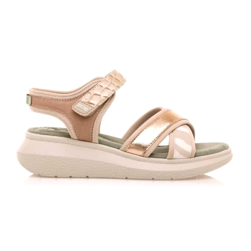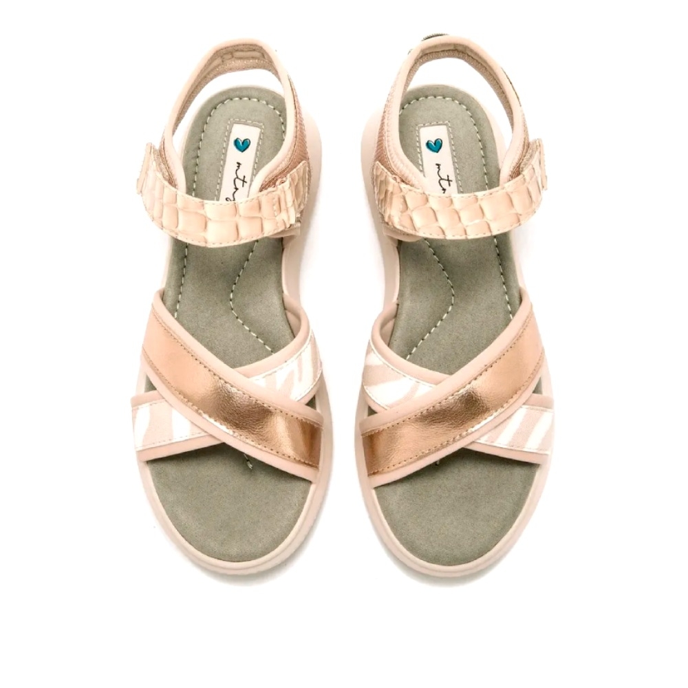 Sandalia Cotton Mustang para mujer, diseñada en color arena, destaca especialmente gracias a sus dos tiras cruzadas en el empeine, diseñadas en acabado metálico. Cierre mediante tiras adhesivas para una pisada más estable. Su suela phylon agregará ligereza y flexibilidad a la pisada. Un modelo ideal para combinar con tus looks favoritos de este verano.