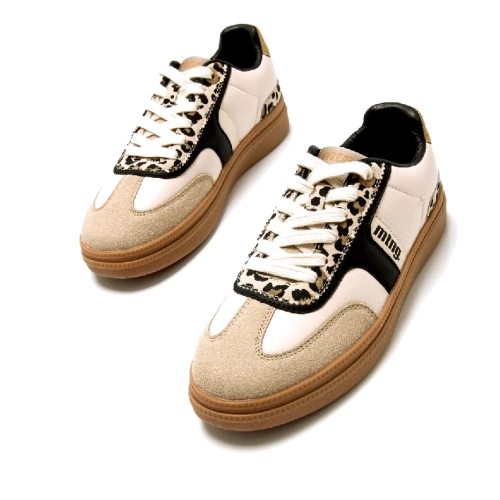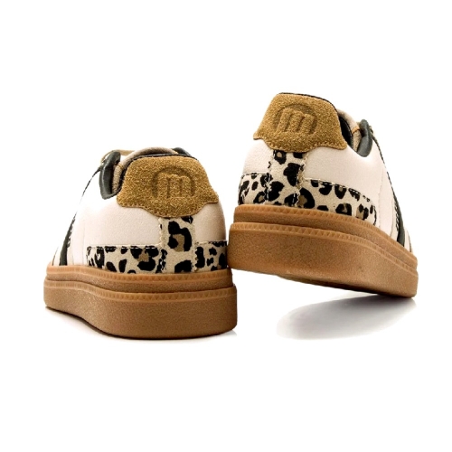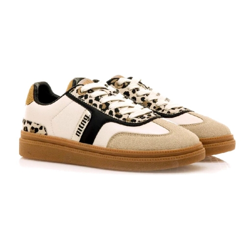 Zapatillas para mujer Cumbia, de Mustang. De color beige. Estas zapatillas destacan por sus detalles negros y de leopardo, aportando un toque atrevido a cualquier look casual. Tienen cierre de cordones y una doble suela, además del logo en el lateral. ¡Atrévete con Cumbia de Mustang!
