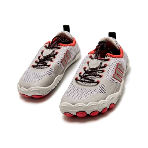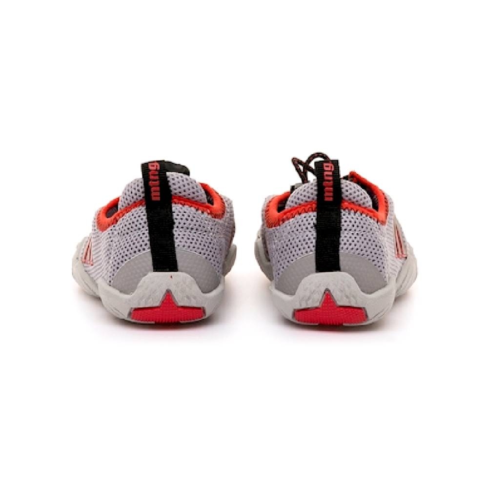 Zapatillas de color gris con detalles en rojo para niño, modelo Scarpo de mtng, de estilo deportivo funcional. Su diseño cerrado con rejilla ligera mejora la ventilación. Incorpora sistema de ajuste con cordón elástico y tope, que facilita el calce rápido y seguro. La suela con relieve y el contorno de los deditos asegura comodidad. Un modelo dinámico para que los peques disfruten en los meses cálidos.