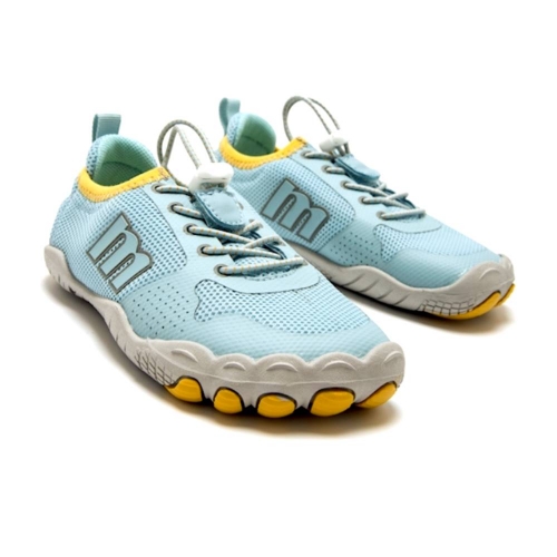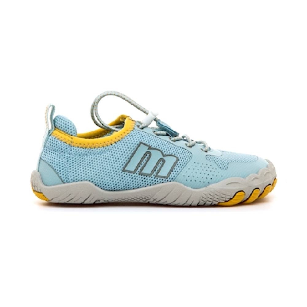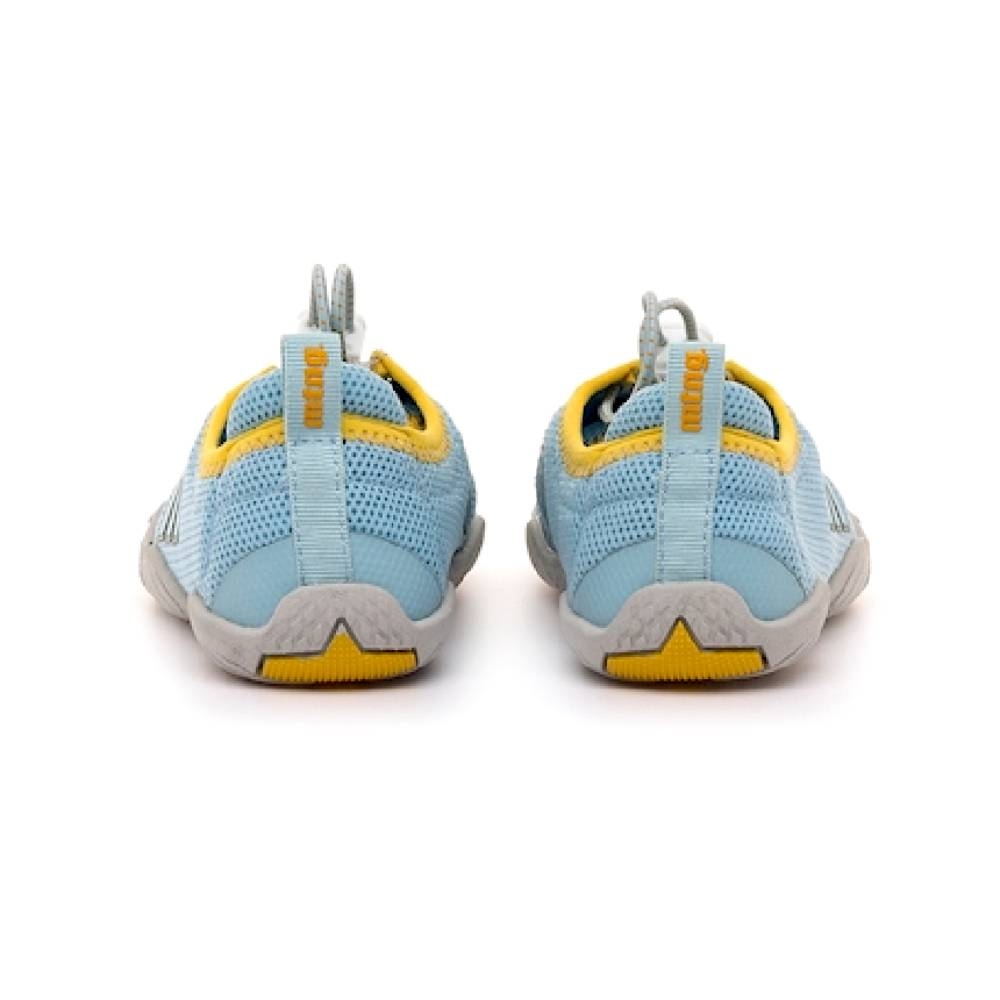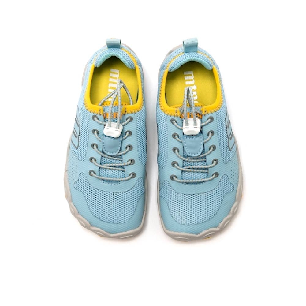 Zapatillas estilo deportiva de color azul claro para niño, modelo Scarpo de mtng con detalles en amarillo. El corte en malla ofrece una buena transpiración, mientras que los cordones elásticos ajustables con tope permiten un calce rápido y seguro. La suela con forma de deditos con refuerzo en la puntera aporta comodidad. Con certificado VEGANO sellado por INESCOP, el cual garantiza que la naturaleza química principal del material no se corresponde con fibras de origen animal.