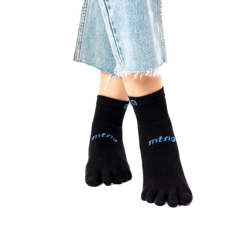 Calcetines barefoot de color negro para adultos de la marca Mustang, modelo Free Socks. Diseñados para adaptarse al movimiento natural del pie. Respeta la separación anatómica de los dedos, lo que favorece la movilidad y mejora la sensación al caminar. Cuentan con agarre ergonómico de talón para evitar deslizamientos y una banda elástica en el arco que proporciona mayor sujeción durante el uso. Destacan los logos de la marca bordados en azul, que aportan un detalle visual distintivo.