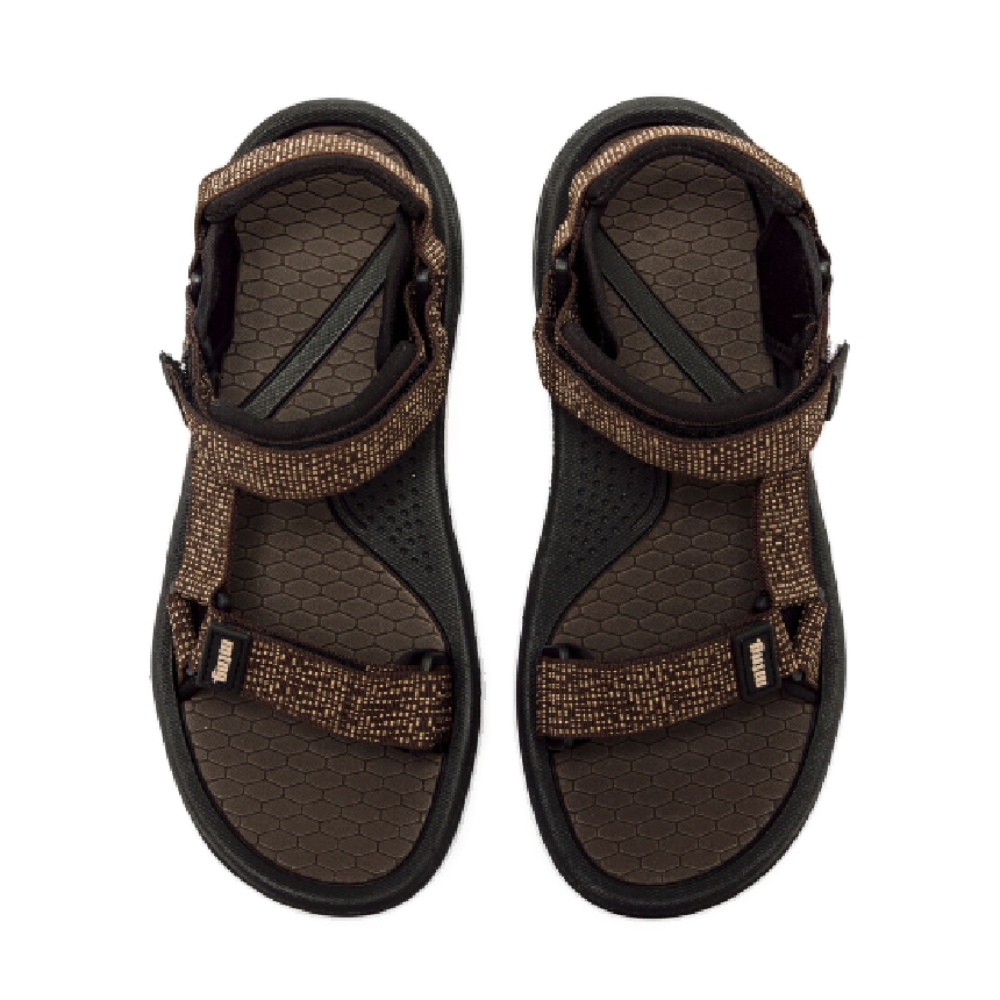 Sandalias deportivas de color marrón para hombre, modelo Solana de Mustang con diseño de tiras ajustables. Incorporan cierre adherente en empeine y tobillo que permite adaptar mejor el ajuste al pie. El estampado moteado de color arena aporta un toque atractivo. Su plantilla de acabado texturizado aporta comodidad y estabilidad al caminar, mientras que la suela gruesa de color negro refuerza su estética funcional. Un diseño pensado para planes activos en días cálidos.