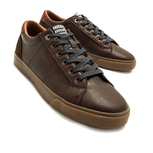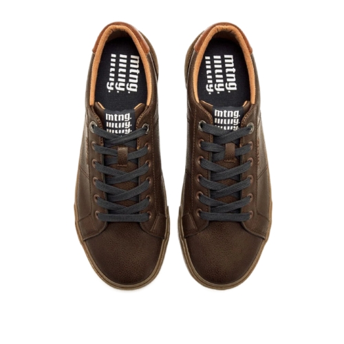 Zapatilla de color moka para hombre, modelo Aria de Mustang. Su diseño tipo bamba incluye suela marrón de goma de perfil bajo, cordones oscuros y detalles en el talón que combinan ante y refuerzo en color cuero. El acabado de la parte superior es ligeramente texturizado, ofreciendo un look actual y fácil de combinar con prendas informales. Su construcción ligera y el ajuste cómodo la hacen perfecta para acompañar cualquier plan con estilo relajado.