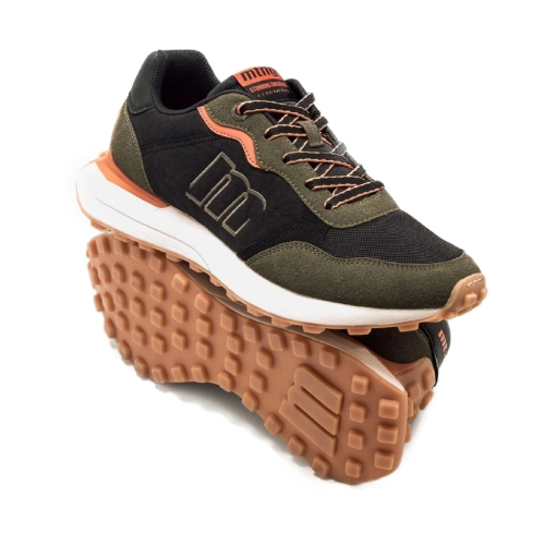 Zapatillas de hombre, modelo Zinc Mustang de color negro con detalles en verde y naranja. Su diseño combina un estilo moderno con una suela dentada que ofrece un excelente agarre en diferentes superficies, ideal para un look casual y funcional. Incorporan una plantilla extraíble con tecnología Starfit y diseño termoconformado, que se adapta perfectamente al contorno del pie para ofrecer un soporte óptimo. Gracias a la espuma Comfort Foam, garantizan una amortiguación excepcional y comodidad durante todo el día.