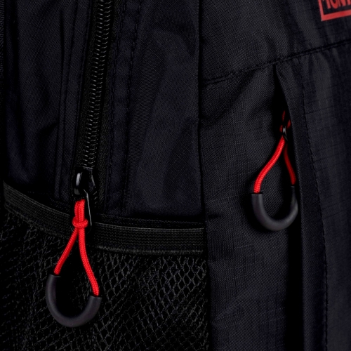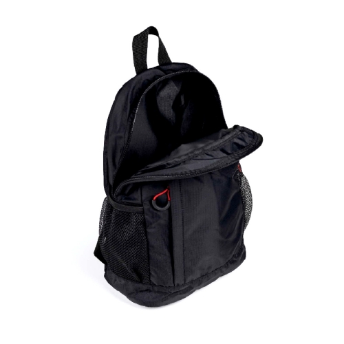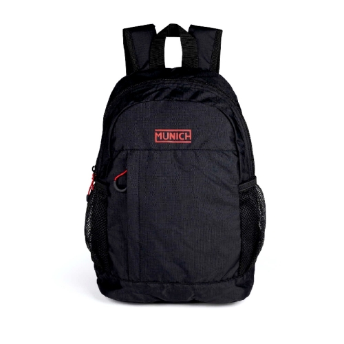 Mochila pequeña negra en formato slim. Incorpora un bolsillo frontal con cremallera en contraste y dos bolsillos laterales de rejilla. Logo Munich en la parte frontal y dos asas de hombro ajustables. MEDIDAS: 21 x 14 x 38 cm CAPACIDAD: 11 Litros PESO: 0,3kg
