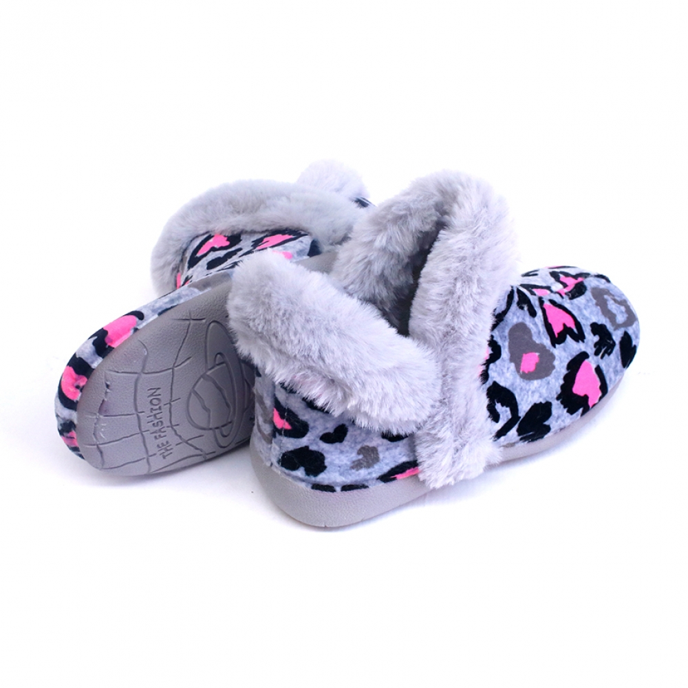 Zapatilla de casa abotinada  en color gris y fucsia para niña y mujer. Un modelo muy calentito y confortable que estarás deseando poner al llegar a casa. Fabricado en suapel y cuello de pelo. Fácil colocación gracias a sus aperturas laterales.  Suela de goma antideslizante.