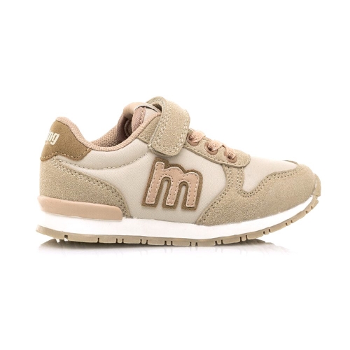 Zapatilla Joggo de niña Mustang de color crudo, combinada en diferentes tonalidades de la misma gama de color, destacando la combinación en tonos marrones como la trasera y el perfilado del logo de la marca. Tiene cierre de cordones planos y tira adhesiva en el empeine con piso bicolor y puntera ligeramente levantada para mejorar la pisada. Para que vayan cómodas y ligeras este invierno, que no se queden sin ellas.