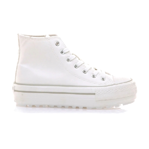 Zapatilla abotinada Bigger-T Mustang para mujer, diseñada en piel sintética de color blanco, con cierre de cordones al tono. Destaca gracias a su cómoda doble suela. Logo de la marca en la lengüeta. Suela dentada para una pisada más estabilizada. Actualizará tu estilo diario como nunca habías imaginado. Con certificado VEGANO sellado por INESCOP, el cual garantiza que la naturaleza química principal del material no se corresponde con fibras de origen animal
