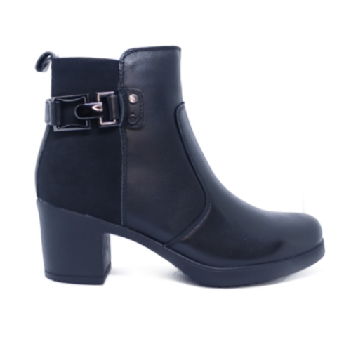 Botín de tacón en color negro, fabricado en piel. Forro téxtil y plantilla memory foam extraíble. Cierre de cremallera lateral. Suela flexible antideslizante. Cómodo tacón ancho de 6 cm de altura.