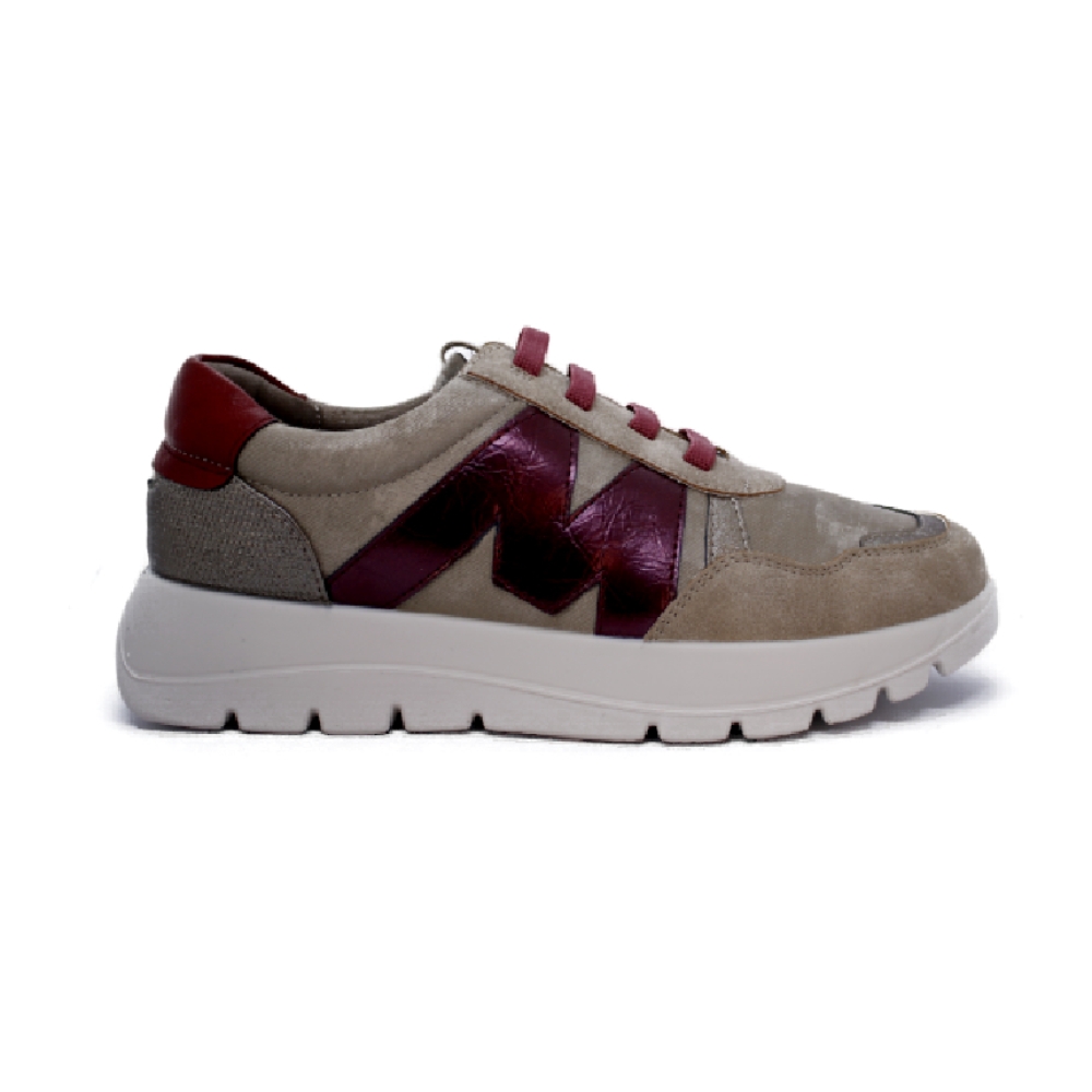 Zapatilla de estilo casual o deportivo, con una suela gruesa y una parte superior que combina diferentes texturas y colores.  Predominan los tonos neutros como el beige o crema en la mayor parte de la zapatilla, con detalles en marrón oscuro o burdeos, formando un patrón distintivo en forma de "M" en los laterales, y una sección en gris o topo en la parte trasera. Confeccionada en tejido transpirable y piel sintética.