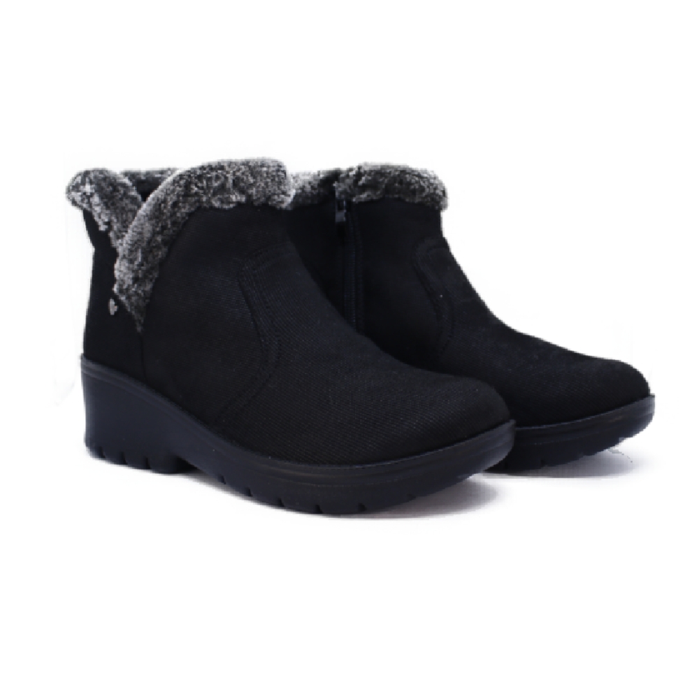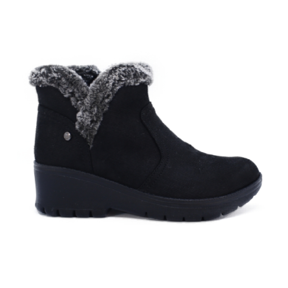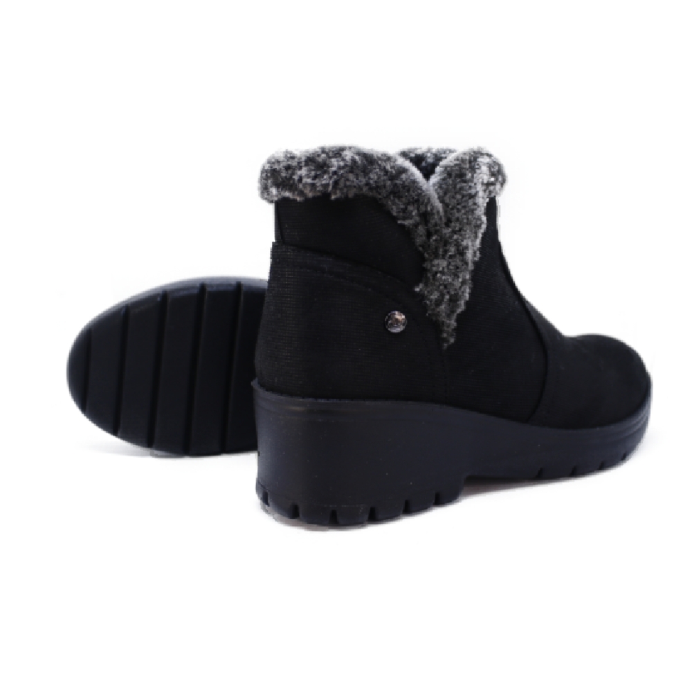 Botín de invierno para mujer, muy cómodo y calentito, fabricado en tejido textil de bamara suave, en color negro. Práctico cierre de  cremallera y apertura en la parte exterior, que nos facilitará su calce en el pie. Adornos: cuello de pelo muy suave, pespuntes al tono. Forro y plantilla acolchada ambos en textil al tono. Suave cuña realizada en material antideslizante. Resistente al agua.
