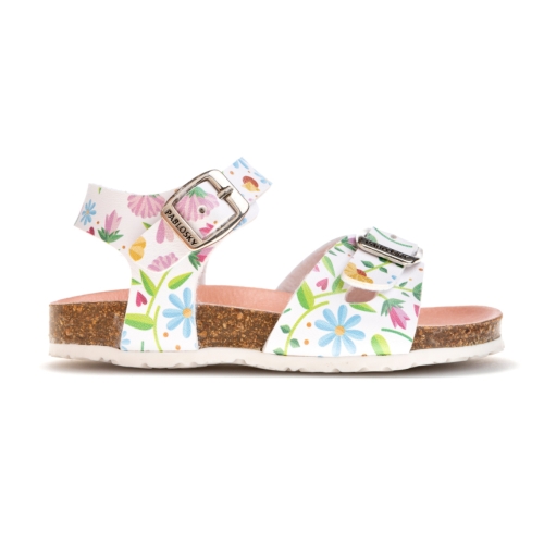Sandalia bio de Pablosky  en color blanco con flores estampadas para niña. Un modelo muy confortable y divertido para las aventuras de tu peque este verano. Fabricadas en materiales de primera calidad para asegurar una correcta transpiración y avalados por expertos podólogos.