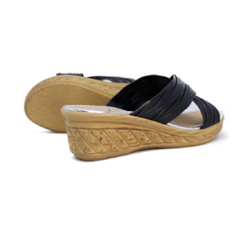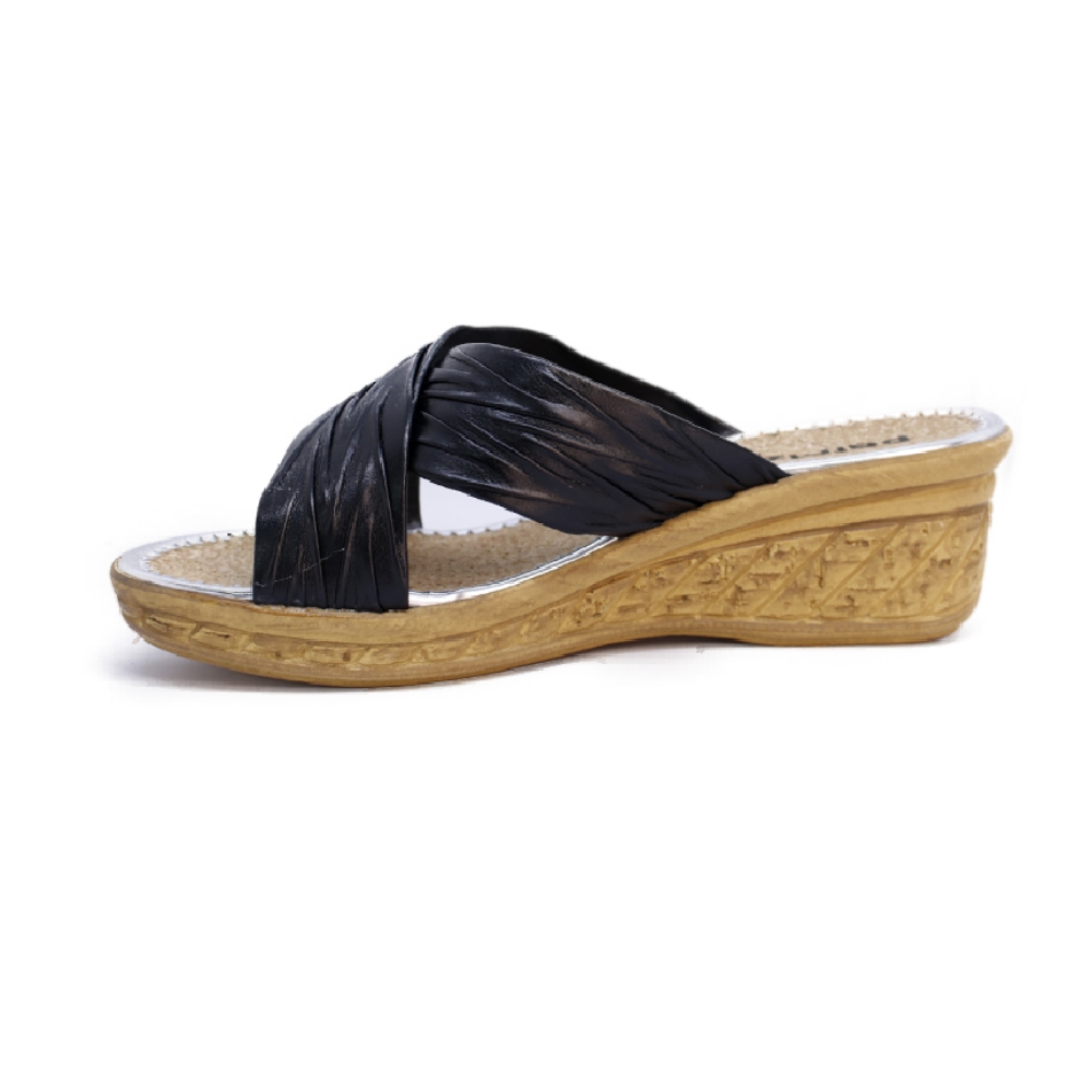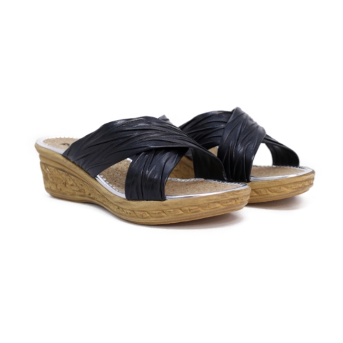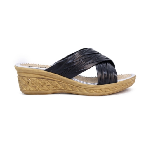 Esta sofisticada sandalia tipo mule de la marca Patrizia destaca por su diseño funcional y elegante, ideal para la temporada de verano. Presenta un corte de tiras cruzadas en color negro con un acabado texturizado que aporta un brillo sutil y versátil.