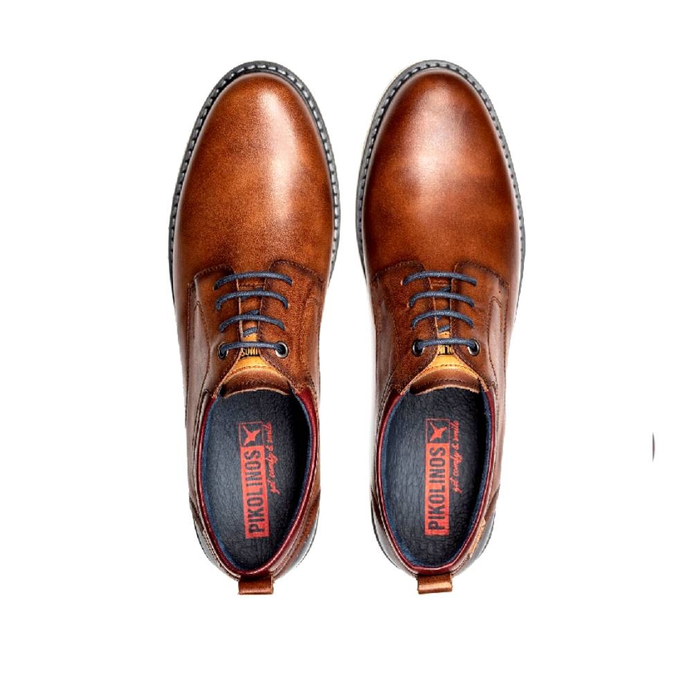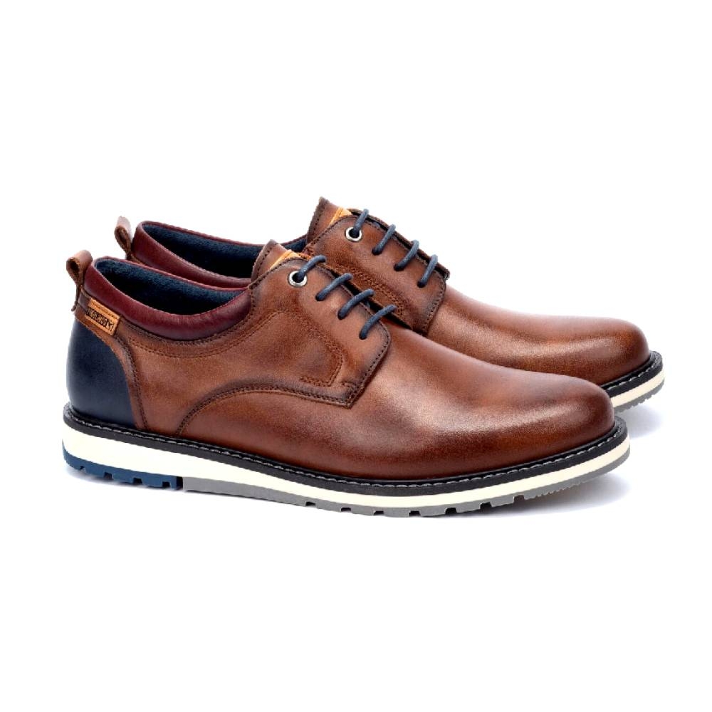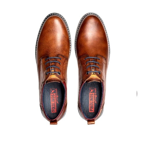 Este modelo de Pikolinos combina tradición artesanal y diseño actual en un zapato de cordones para hombre, fabricado en piel de primera calidad en tono cuero. El detalle en color marino en el talón aporta un contraste moderno y elegante, realzando su estilo versátil.