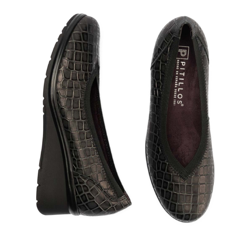 Salón con cuña muy cómoda de la marca Pitillos. Fabricado en piel de vacuno con efecto brillo, detalles en casi todo el corte metálicos. Modelo mas ancho. Suela tipo cuña media con plataforma para que nos resulte mas cómoda la pisada. Detalle de ribete pintado oro en el filo del zapato. Ajuste mediante ribete elástico en el contorno del corte, favoreciendo el ajuste. Plantilla acolchada extraíble. Calce de talla habitual y se adapta a juanetes.
