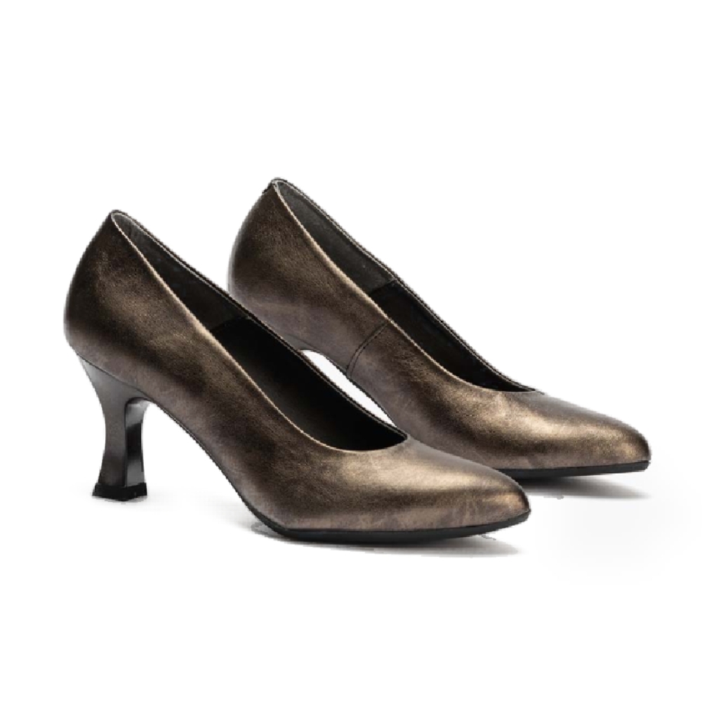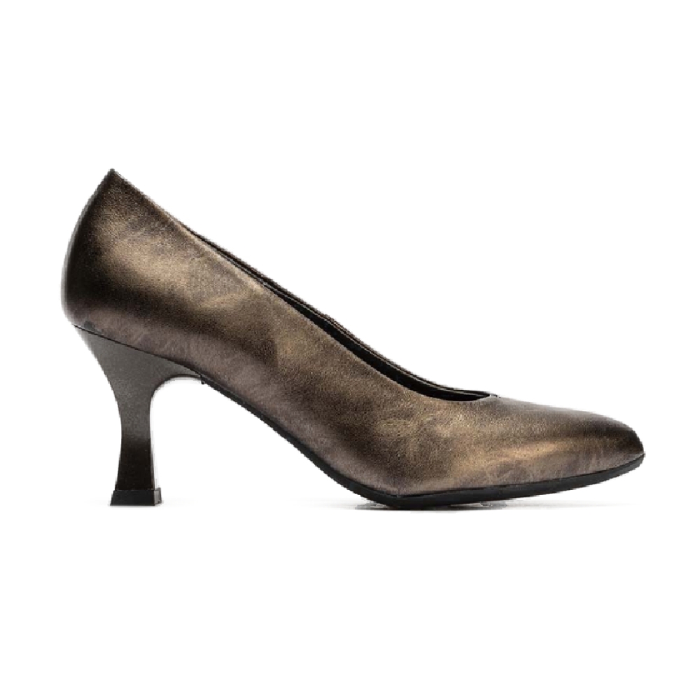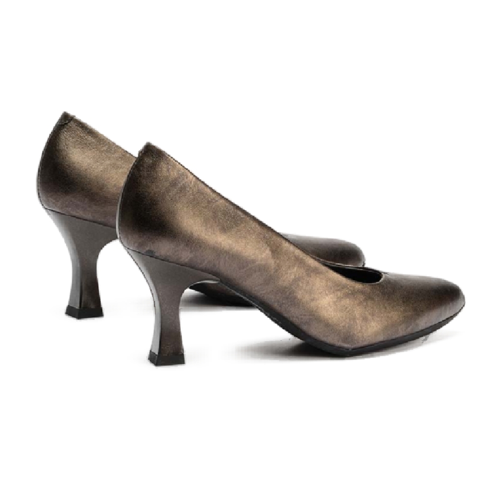 Zapato tipo salón con tacón alto y punta fina fabricado en suave PIEL color bronce envejecido. Interior forrado en microfibra 100% transpirable. Plantilla acolchada de microfibra.
