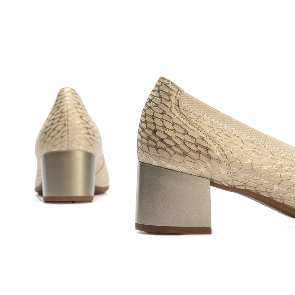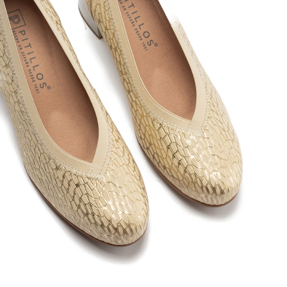 Zapato de salón escotado para mujer, de la marca Pitillos en color dorado. Fabricado con materiales de piel de primera calidad, repleto de brillos para dar vida a todos tus outfits. Ribete de goma elástica, para adaptarse perfectamente a la anatomía del pie, ofreciendo un buen ajuste y facilitando el calce. Puntera redondeada. Plantilla acolchada color cuero, de gran comodidad, con nombre de la marca grabado. Suela de goma antideslizante, con tacón ancho de apróx. 4,5cm de altura.