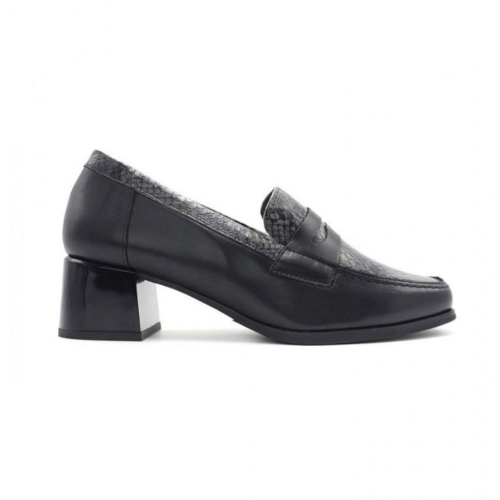 Zapatos medio tacón estilo mocasín de mujer fabricados en piel lisa color negro combinada con piel imitación serpiente gris en la pala de alta calidad.