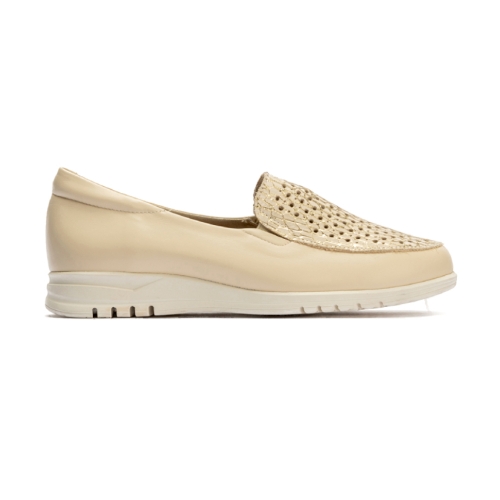 Mocasín o Manoletina de mujer combinada piel con grabado y suela de goma CREMA. Con una pequeña cuña de 2 cm y plantilla extraíble, se va a convertir en tu zapato favorito esta primavera. Flexible y ligero para que te acompañe en tu día a día.
