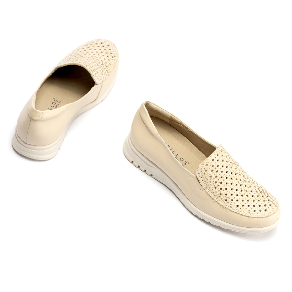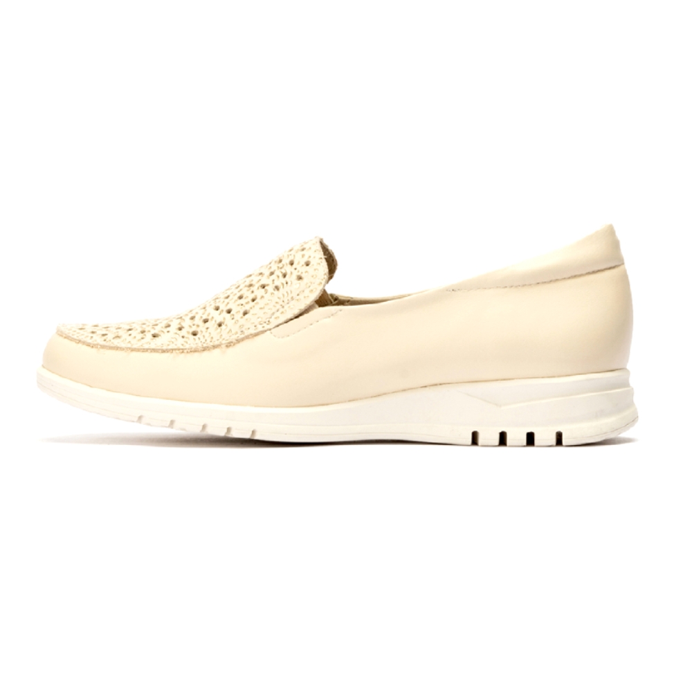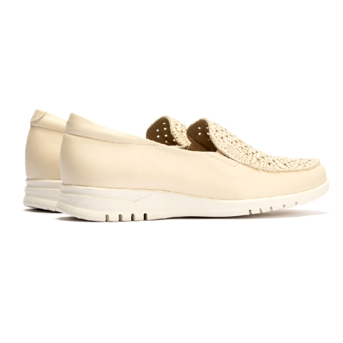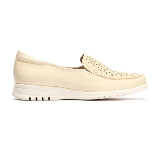 Mocasín elaborado en piel color crema. La piel es suave, por lo que se adapta con facilidad a la forma del pie. Los picados en la pala le aportan un aire más veraniego y fresco. Diseñado con plantilla extraíble Termo conformada y Anti bacterias forrada con Arnedry para una mayor transpiración.