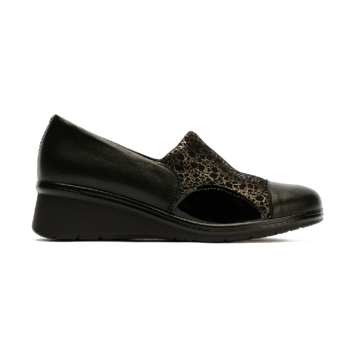 Zapatos Pitillos con cuña para mujer. Fabricados en España. Corte en piel, con charol en los laterales y empeine original abstracto con glitter. El interior se encuentra forrado con un tejido muy suave al tacto y térmico, que absorbe el sudor y combate la aparición de olores. Plantilla extraíble que proporciona confort y bienestar