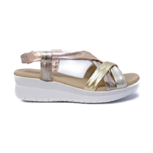 Sandalias de piel con tiras cruzadas tubulares que porporcionan un extra de comodidad. . Cuña de suave pendiente de cuñade  6cm, plataforma 4cm, suela blanca de goma,.  Bonito diseño casual en tonos metalizados, que se va a convertir en tu zapato favorito este verano.