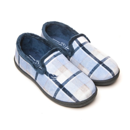 Zapatilla mujer realizada en suave bamara. Diseño de cuadros en tonos beige y azules. Con  borde en pelito y plantilla extraíble de Plumaflex. Bonitas y cómodas  100%