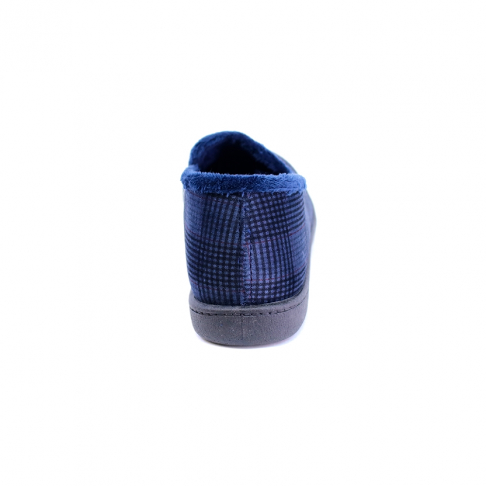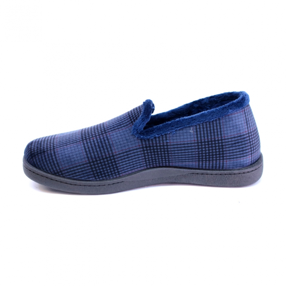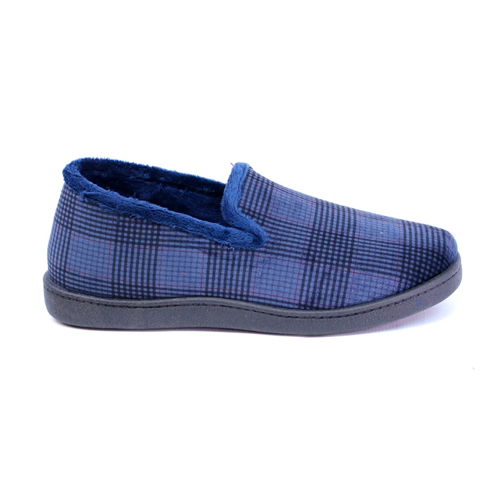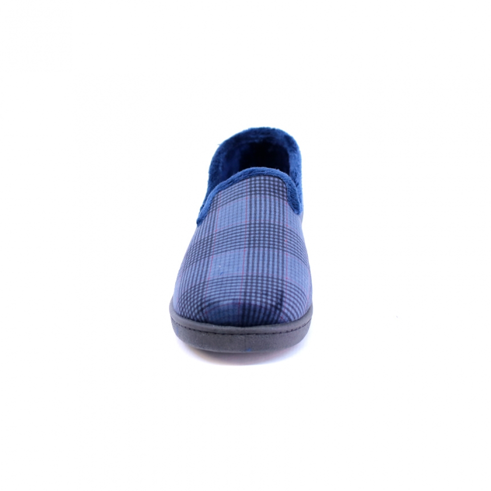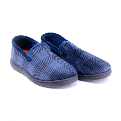 Zapatilla hombre en paño de color azul con cuadros "Príncipe de Gales" en tonos negros y granates. Plantilla plumaflex extraíble. Suela de pvc. Talla amplia.