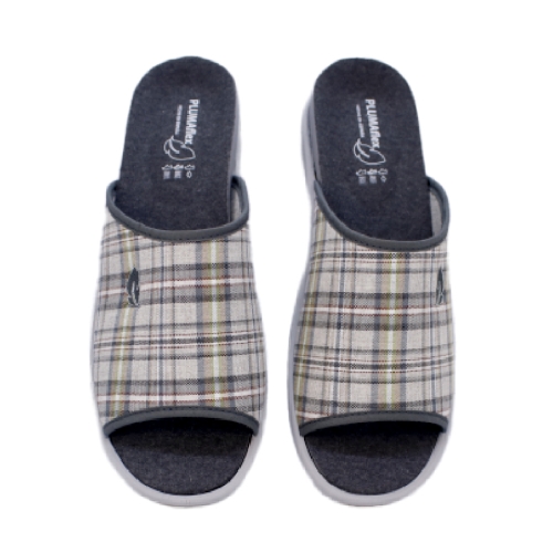 Zapatillas de estar en casa para hombre abiertas. Fabricadas en material textil suave y fresco de primera calidad, Dispone de plantilla extraíble para facilitar la higiene permitiendo, además, el uso de una propia en caso necesario. La plantilla que incluye está fabricada con la tecnología Pluma Flex, aportando una comodidad máxima en cada pisada. Suela de goma flexible y antideslizante. Hechas en España.