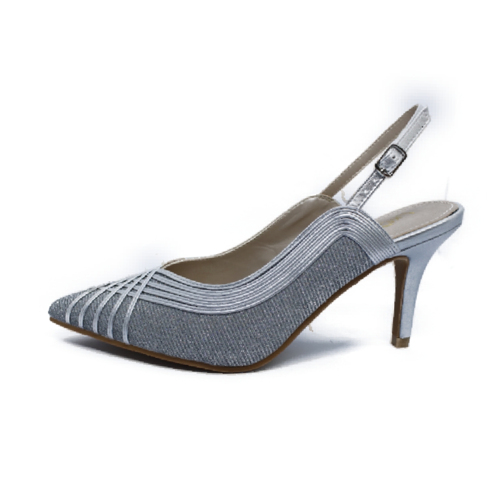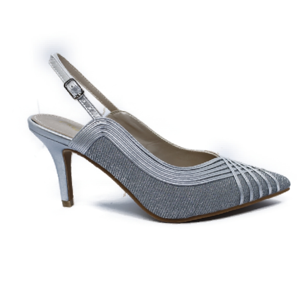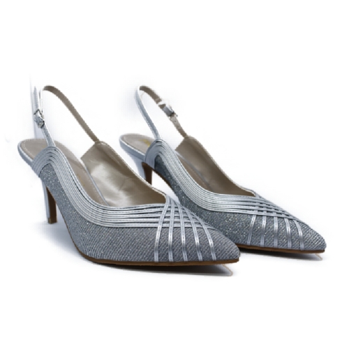 Salón destalonado realizado en material plateado glitter y tiras plateadas cruzadas. Plataforma interna de 1 cm y tacón fino de 7 cm. Un zapato elegante que por su comodidad, se va a convertir en tu favorito para celebraciones. Interior forrado en piel.