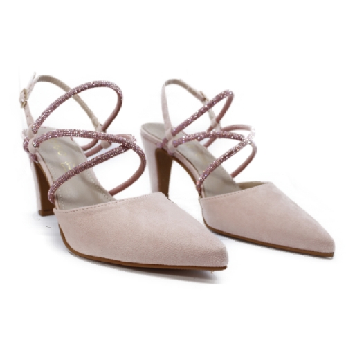 Zapato tacón medio mujer  para mujer en color nude, con cierre de hebilla, altura del tacón 8 cm, zapato de salón destalonado para vestir,. Incorpora tiras gliter a tono que consiguen ajustar perfectamente el zapato. Material exterior de antelina forro interior de piel y plantilla de piel acolchada. Plataforma interna de 1 cm.