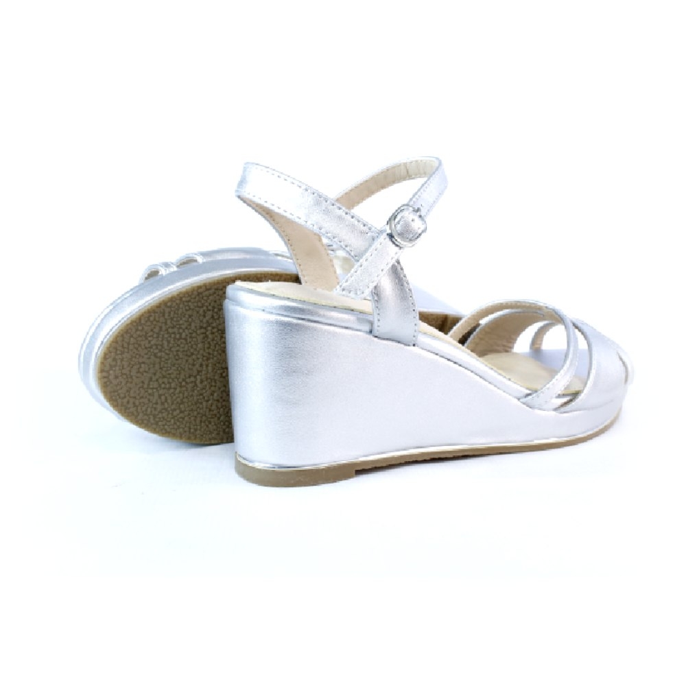 Sandalia plateada con cuña de 6 cms, ideal para quienes no quieren o no pueden llevar tacones y no quieren renunciar a un zapato de ceremonia. Interior de piel plantilla de piel acolchada. Se ajusta mediante cierre de hebilla