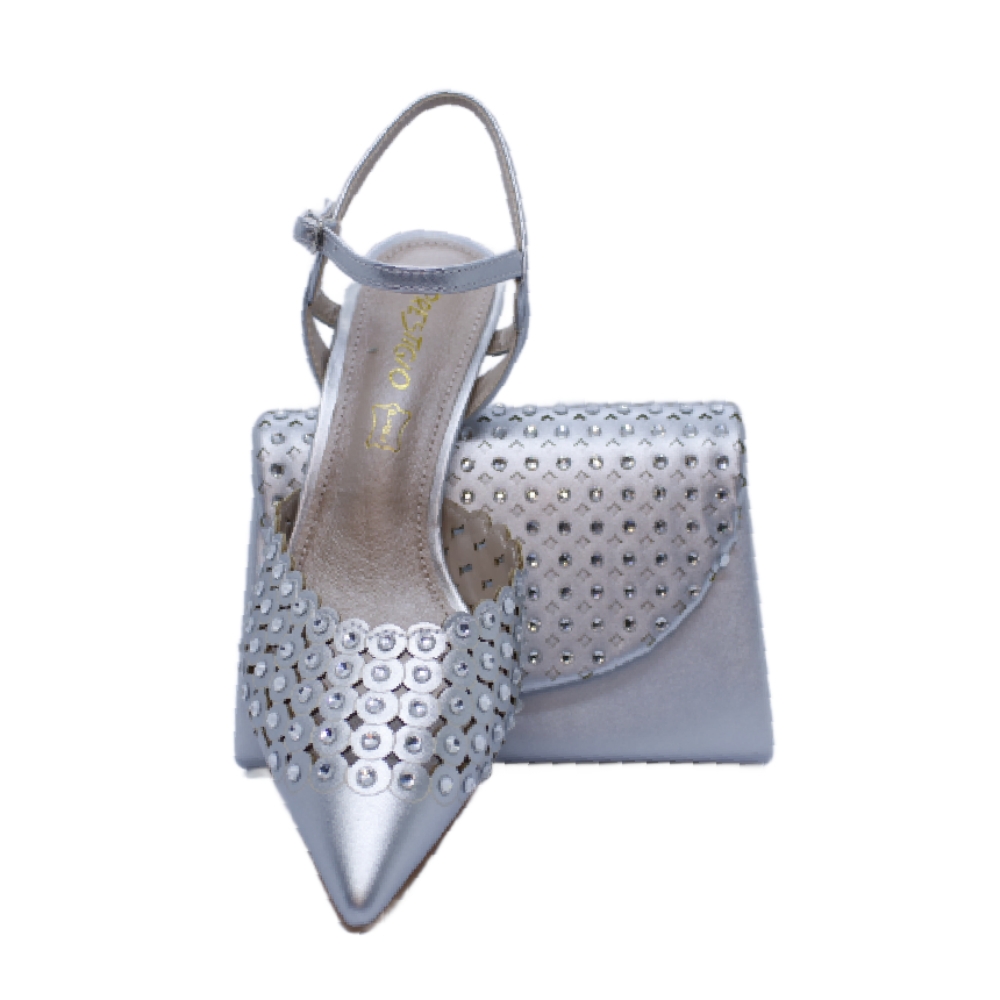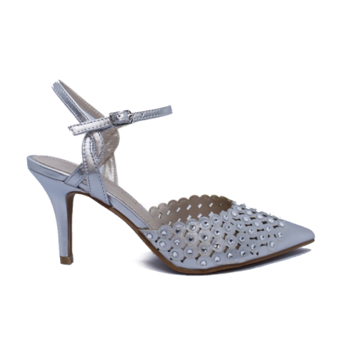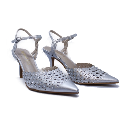 Zapato de salón abierto en el talón, con cierre de hebilla, ideal para eventos y ocasiones especiales. Fabricado en polipiel suave y transpirable en tono plata, con un diseño de fabricación 100% española.