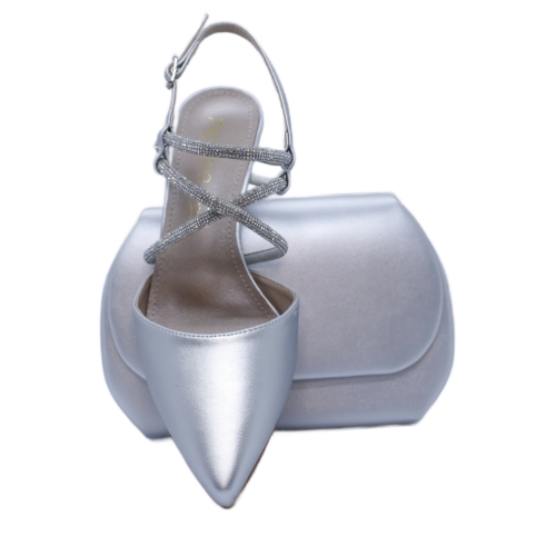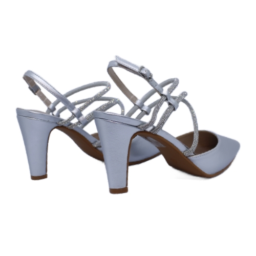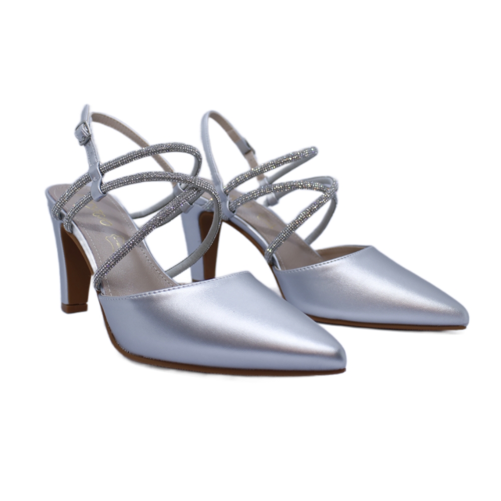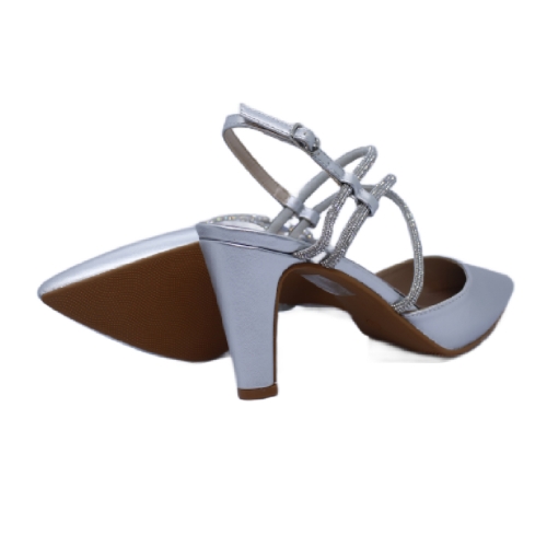 Este elegante zapato de salón en color plateado está diseñado para ocasiones especiales, brindando tanto estilo como comodidad. Fabricado en polipiel de alta calidad, presenta una estructura con puntera fina y tacón alto de aproximadamente 8-9 cm, ideal para estilizar la figura. Su diseño se realza con delicados tirantes cruzados decorados con strass brillante, que añaden un toque de sofisticación y se ajustan con un cierre de hebilla en el talón para mayor seguridad y ajuste.