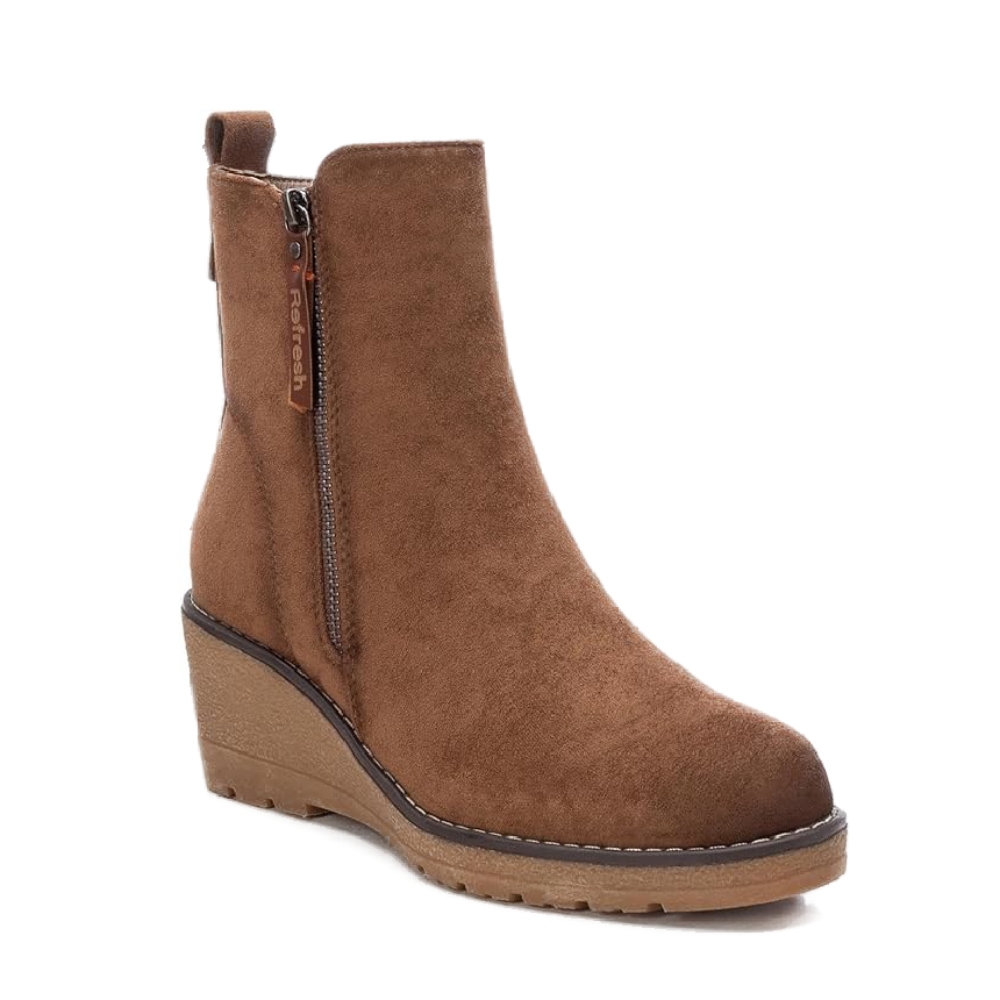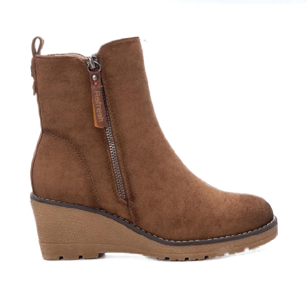 Botín de mujer, de la marca Refresh. Fabricado en antelina. Cierre mediante cremallera lateral. Tirador trasero para facilitar la puesta. Cremallera lateral decorativa. Cómoda cuña de 6 cm con suela de goma antideslizante. Este modelo ha obtenido el certificado vegano por la organización mundial PETA (Organización de los derechos de los animales).