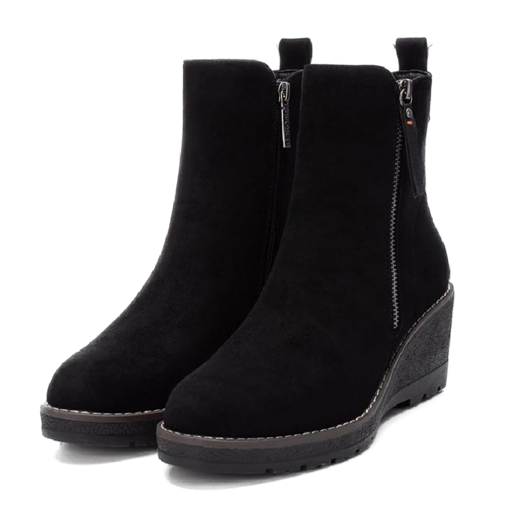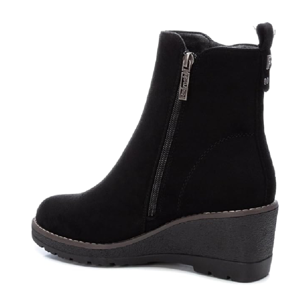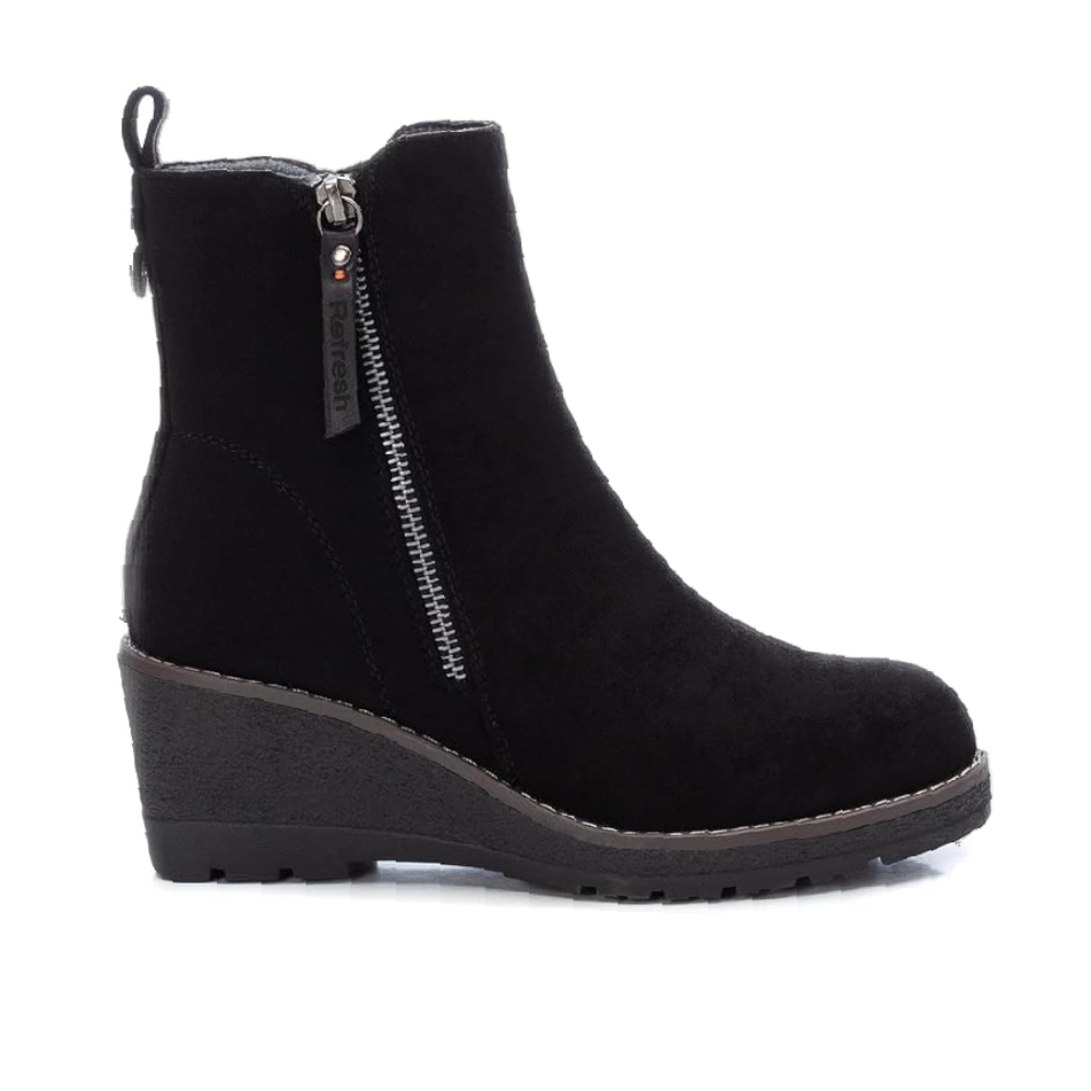 Botín de mujer, de la marca Refresh. Fabricado en antelina. Cierre mediante cremallera lateral. Tirador trasero para facilitar la puesta. Cremallera lateral decorativa. Cómoda cuña de 6 cm con suela de goma antideslizante. Este modelo ha obtenido el certificado vegano por la organización mundial PETA (Organización de los derechos de los animales).