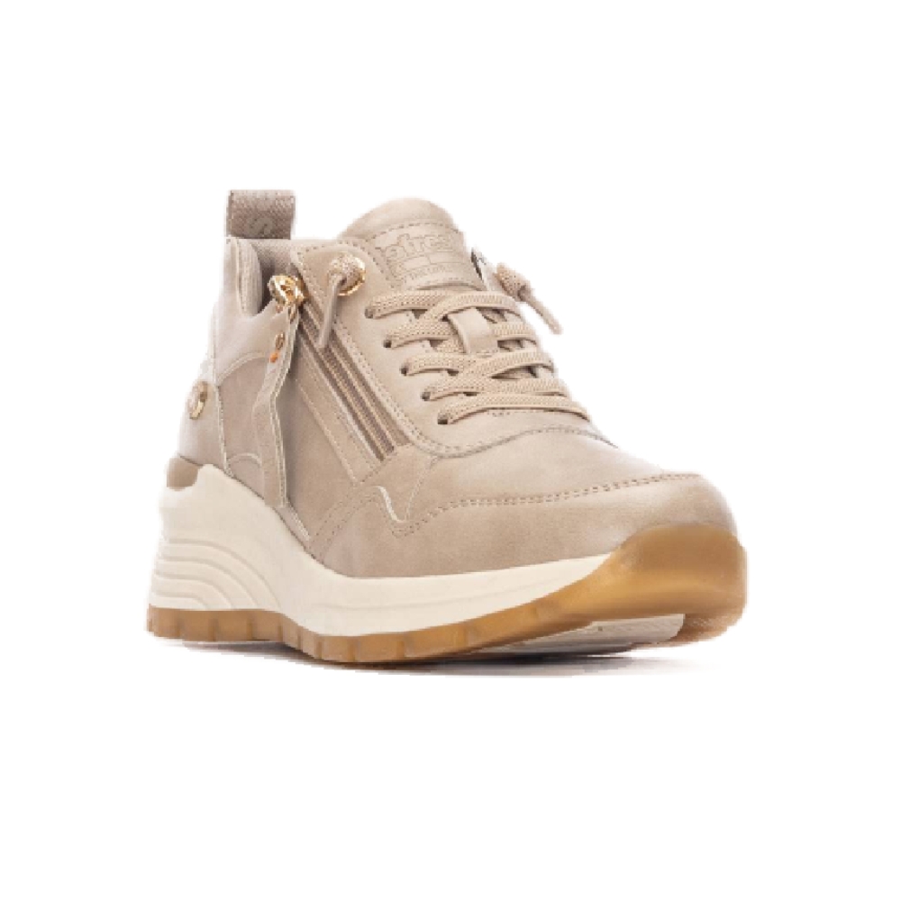 Zapatilla de mujer, de la marca Refresh. Fabricada en material que imita a la piel. Cierre mediante cremallera en el lateral. Cordones elásticos al tono. Tirador trasero para facilitar la puesta. Con