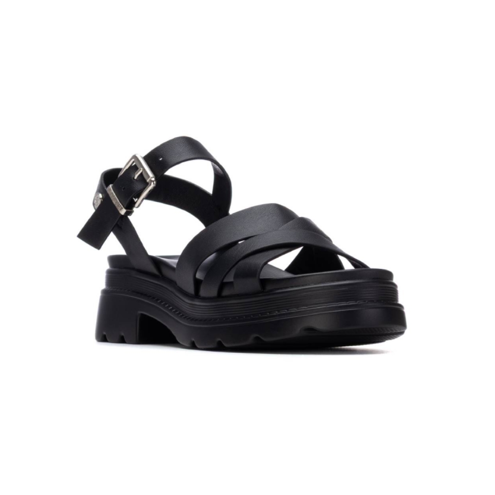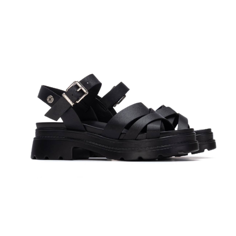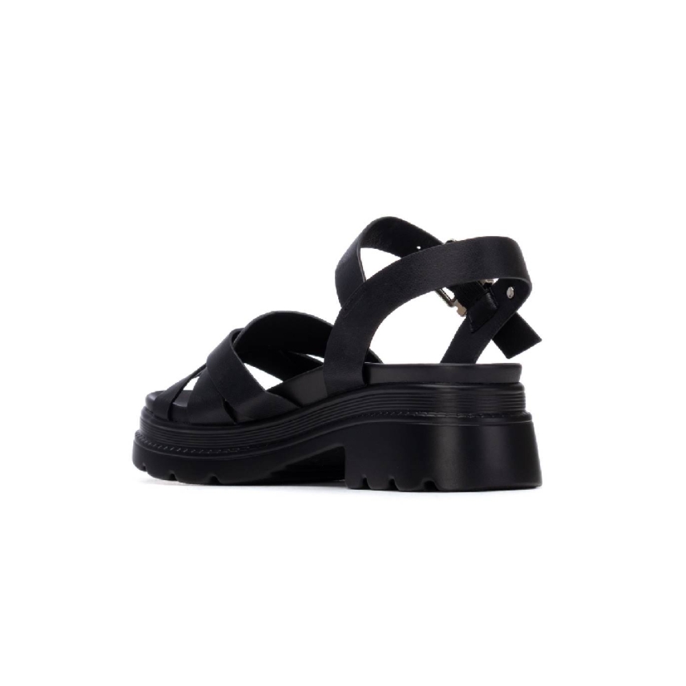 Sandalia de tiras cruzadas de mujer, con cierre de hebilla. Modelo cómodo, fabricado en piel sintética, con suela de goma ligera y antideslizante. Planta acolchada. Color negro. Sandalia con tacón y plataforma de 5 cm. de altura. Certificado vegano.