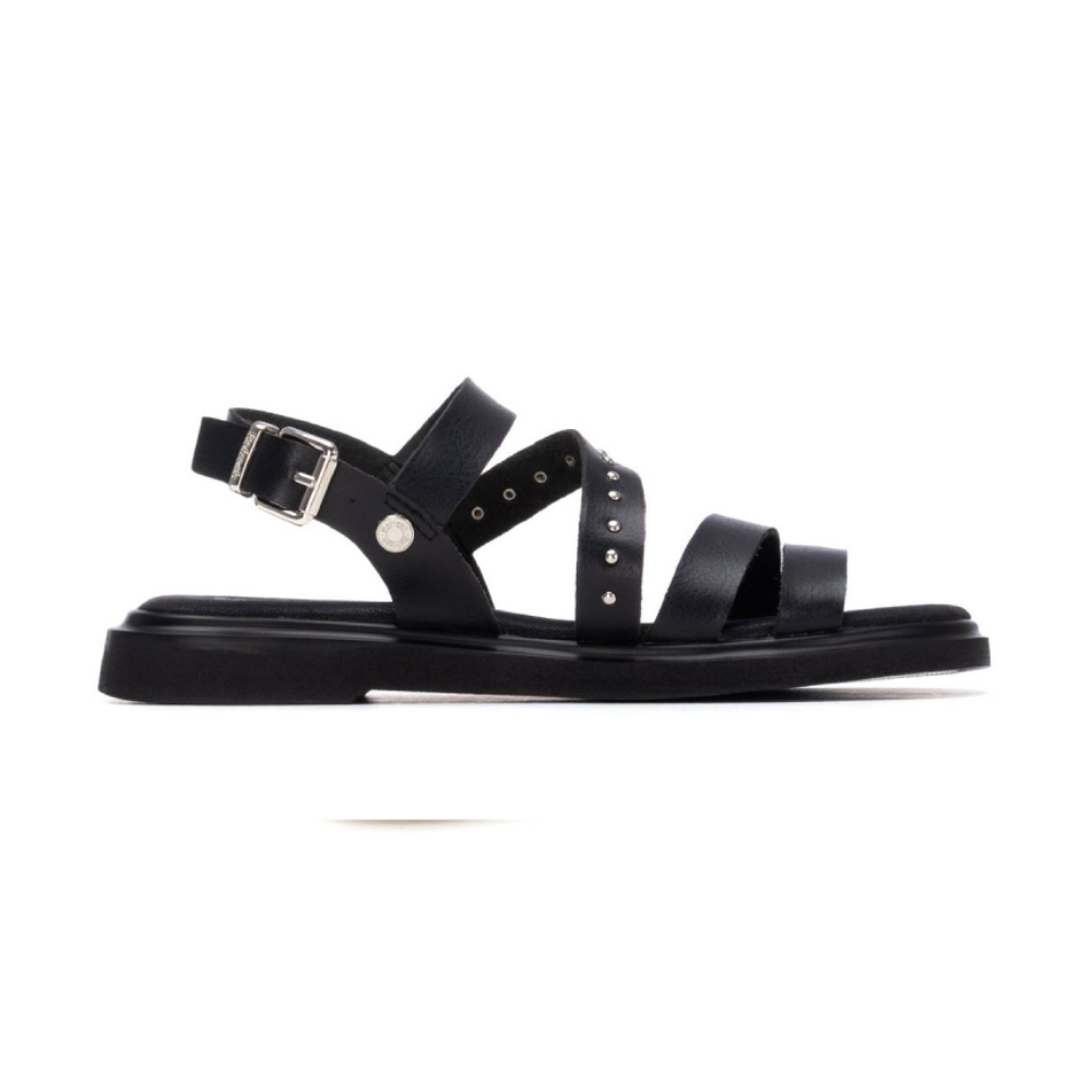 Diseño de Pala Cruzada: El empeine está formado por dos tiras anchas cruzadas en color negro, fabricadas en un material sintético de alta calidad con un acabado suave y mate.