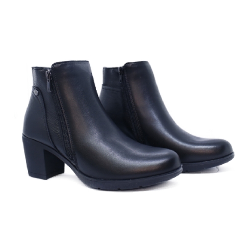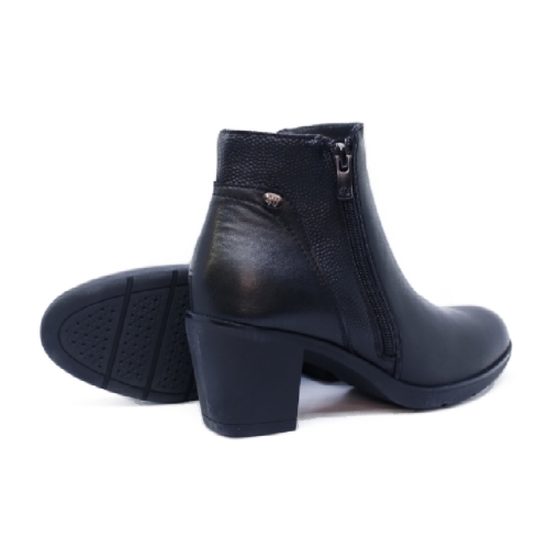 Botín de piel con cierre de cremallera interior. Realizado en piel negra se va a convertir en tu favorito gracias a lo bien que se adapta en tu pie. Sin apenas costuras para no molestarte en ningún momento. Plantilla en tejido y extraíble. Suela de goma antideslizante con tacón de 5 cm.