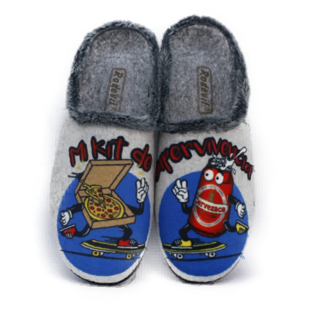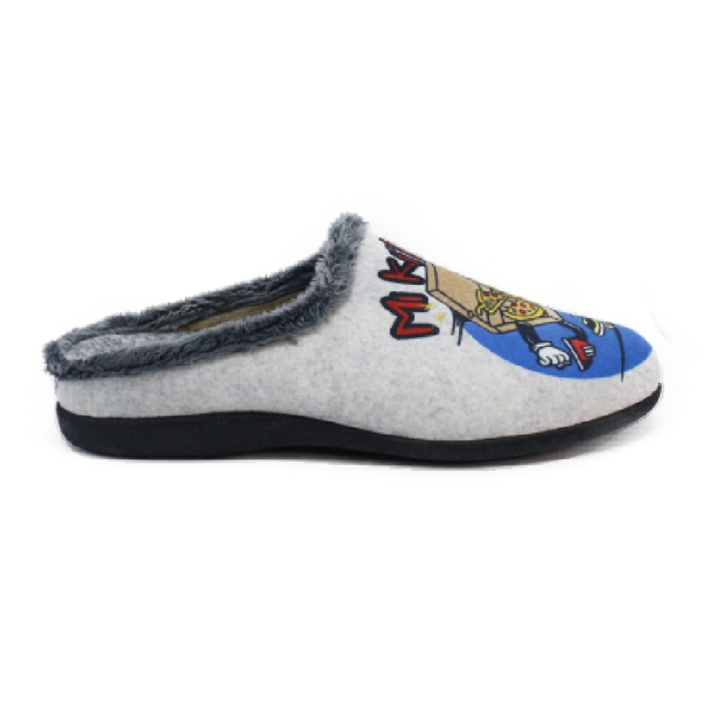 Zapatilla descubierta de  hombre fabricada en tejido suapel muy confortable y cálido. con divertidas imágenes de una "cena light".  Suela de Goma antideslizantes. Apto para lavadora.