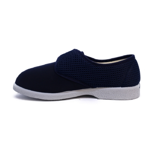 Este calzado combina la resistencia de la lona con la flexibilidad de la licra elástica en la zona del empeine, adaptándose a la forma del pie sin presiones ni rozaduras. Su sistema de cierre adherente  permite un ajuste personalizado y facilita enormemente el calce, siendo ideal para personas con movilidad reducida.