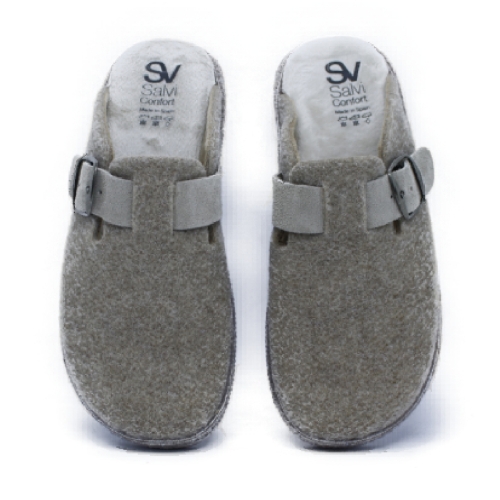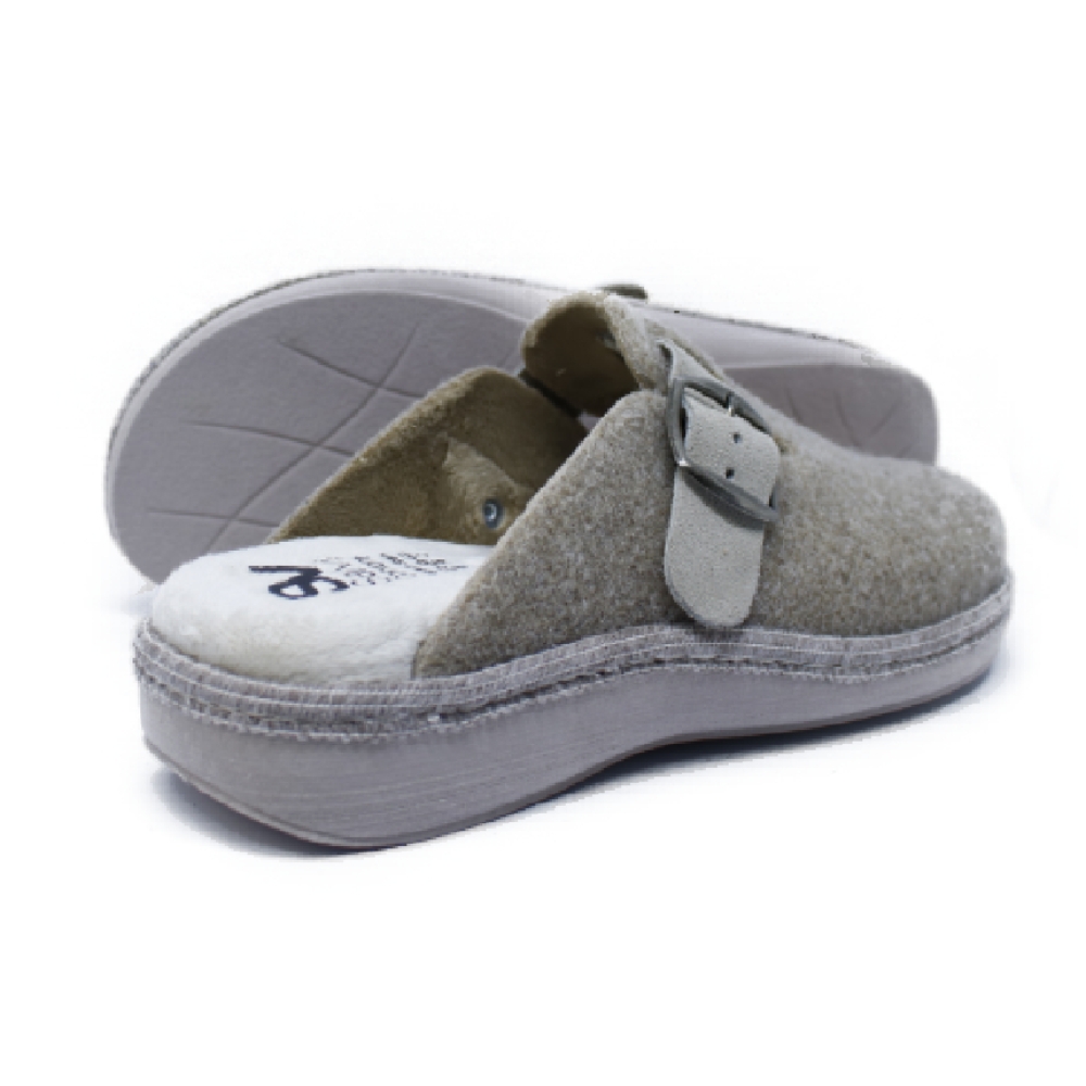 Zapatillas de casa en color beige con hebilla lateral y pelo en la plantilla extraíble. Son una opción cómoda y acogedora para el hogar. El pelo en la plantilla proporciona una sensación suave y cálida, manteniendo tus pies abrigados en todo momento. Perfectas para disfrutar de la calidez y el confort en casa.