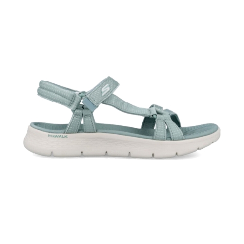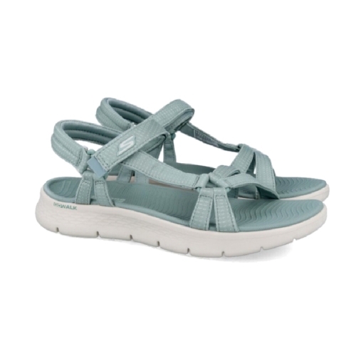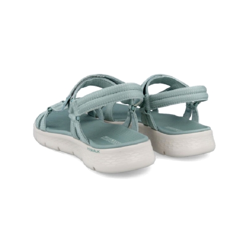 Sandalias Skechers Go Walk Flex Sublime 141451 de mujer en color verde. Presentan un estilo trekking, cierre con tira adhesiva, piso de 2 cm, piso de goma termoplástica, exterior textil e interior forrado textil con plantilla sintética.